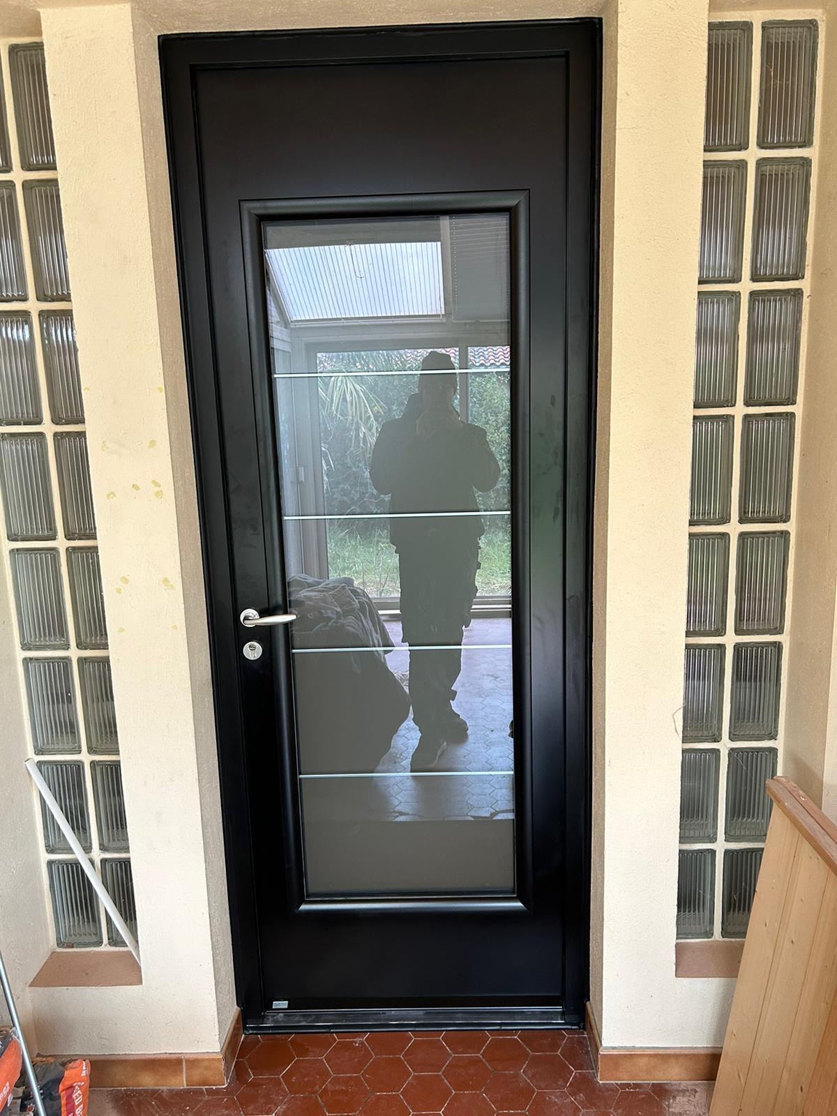 - Une porte d’entrée en acier modèle Parallèle, RAL noir 9005 texturé