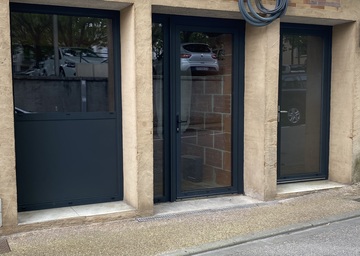 Au rez-de-chaussée, ils ont installé des portes grand trafic en aluminium, ainsi qu'une élégante porte d'entrée modèle BREHAT, accompagnée d'un fixe et d'une fenêtre à deux vantaux, tous en coloris RAL 7016, pour une harmonie parfaite.