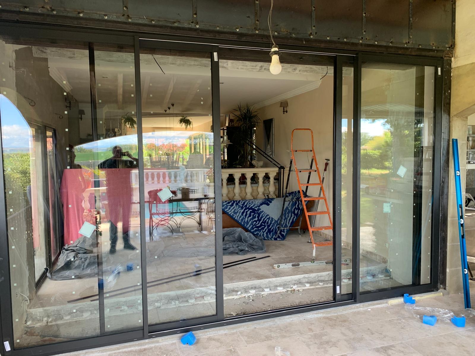 Récemment, nous avons réalisé l'installation d'un superbe coulissant à 4 vantaux avec 2 rails en aluminium noir sablé dans la Commune de Castelnaudary.